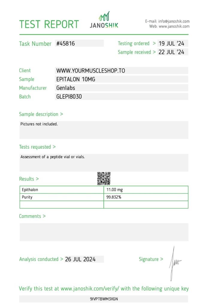 Typical Dosage: 10 mg per day. Administer for 10-20 days, then take a break of several months before repeating the cycle. It’s important to follow recommended dosages and consult with a healthcare provider before starting Epitalon.