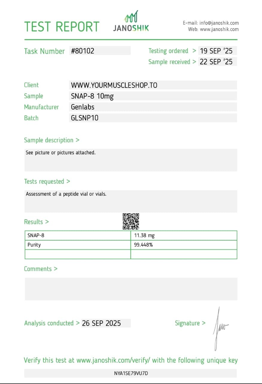 Genlabs SNAP-8 10mg is a powerful yet gentle peptide for those looking to combat visible signs of aging. By softening wrinkles and promoting smoother skin, it offers an effective solution for a youthful, revitalized appearance without the need for invasive treatments.